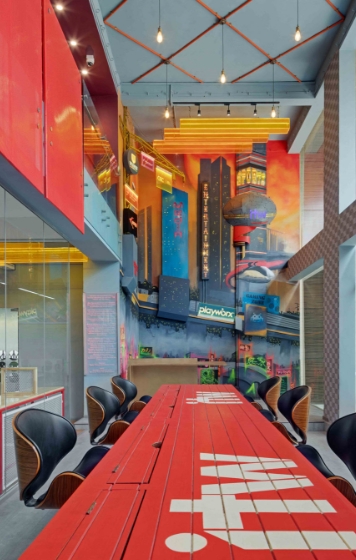A mix of private and open-plan workspaces are decorated like a community room, featuring an eclectic range of graphic art in contrasting pastel and bold tones.